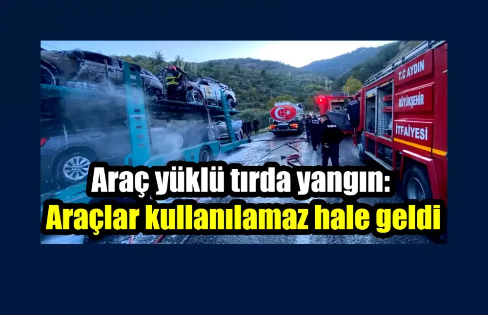 Aydın'ın Bozdoğan ilçesinde üzerinde araç yüklü tırda çıkan yangın ekiplerin müdahalesiyle söndürülürken, tırdaki araçlar kullanılamaz hale geldi.