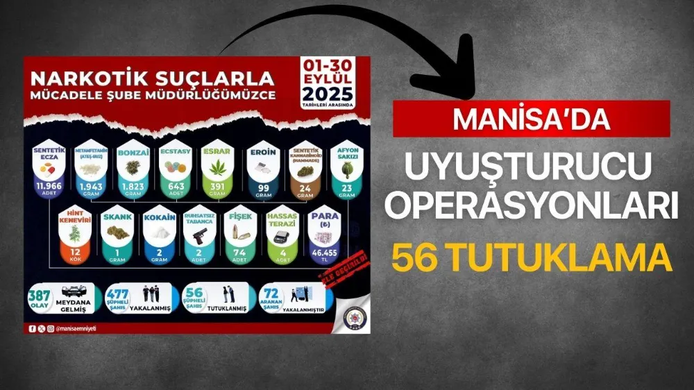 Manisa İl Emniyet Müdürlüğü Narkotik Suçlarla Mücadele Şube Müdürlüğü koordinesinde, Akhisar, Alaşehir, Salihli, Soma ve Turgutlu NSM Büro Amirliklerinin desteğiyle 1-30 Eylül 2025 tarihleri arasında yürütülen çalışmalar sonucunda 387 olay meydana gelirken, 477 şüpheli yakalandı. Şüphelilerden 56'sı tutuklanırken, 72 aranan şahıs da yakalandı. Yapılan operasyonlarda; 11 bin 966 sentetik ecza (hap), bin 943 gram metamfetamin, bin 823 gram sentetik kannabinoid (bonzai), 643 ecstasy hap, 391 gram esrar, 99 gram eroin, 24 gram sentetik kannabinoid hammaddesi, 23 gram afyon sakızı, 12 kök hint keneviri, 1 gram skank, 2 gram kokain, 2 ruhsatsız tabanca, 74 fişek, 4 hassas terazi ve uyuşturucu madde ticaretinden elde edildiği değerlendirilen 46 bin 455 TL para ele geçirildi.