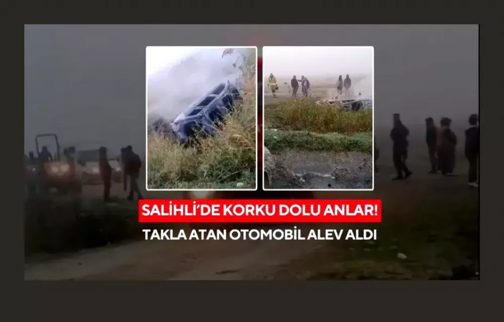 Salihli'de takla atan otomobil alev aldı: Sürücü yara almadan kurtuldu