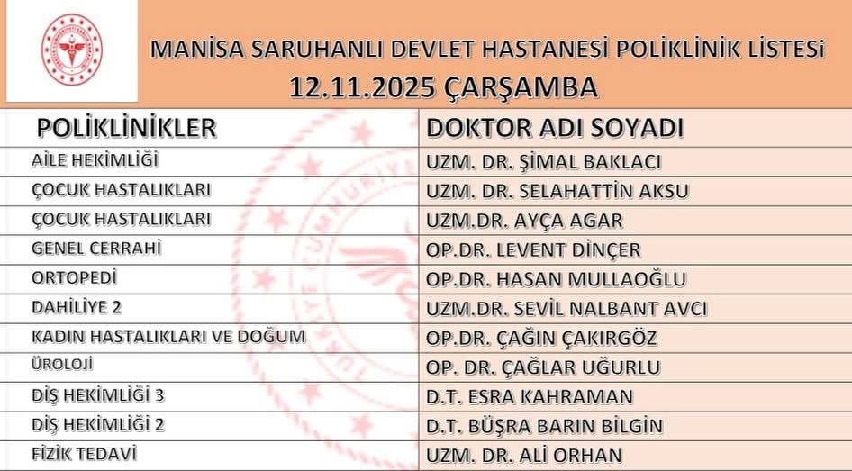Saruhanlı Devlet Hastanesinde 12 Kasım 2025 Çarşamba günü çalışacak Doktorların listesi aşağıda verilmiştir.