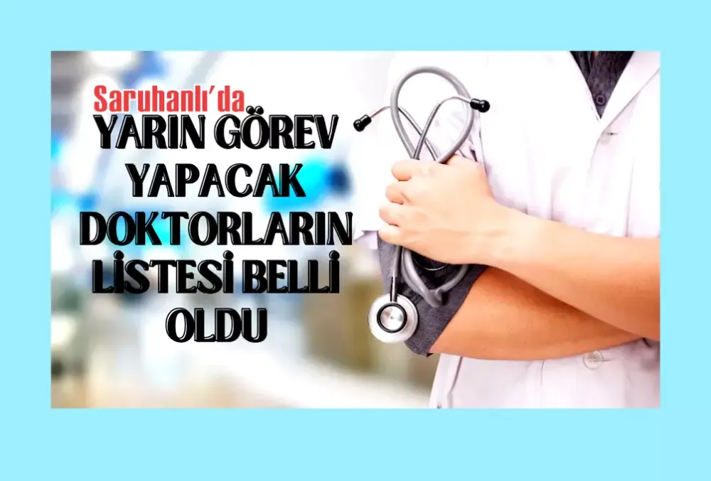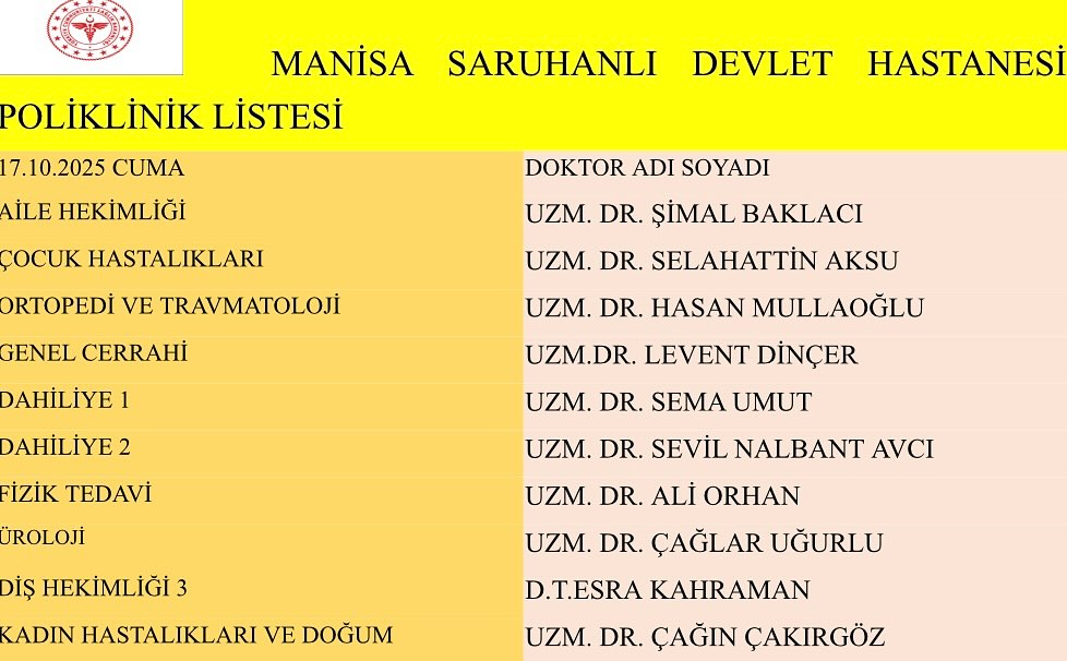 Saruhanlı Devlet Hastanesinde Cuma günü görev yapacak doktorlarSaruhanlı Devlet Hastanesinde 17 Ekim 2025 Cuma günü çalışacak Doktorların listesi aşağıda verilmiştir.Saruhanlı Kardelen Gazetesi ailesi olarak tüm hastalarımıza acil şifalar dileriz…
