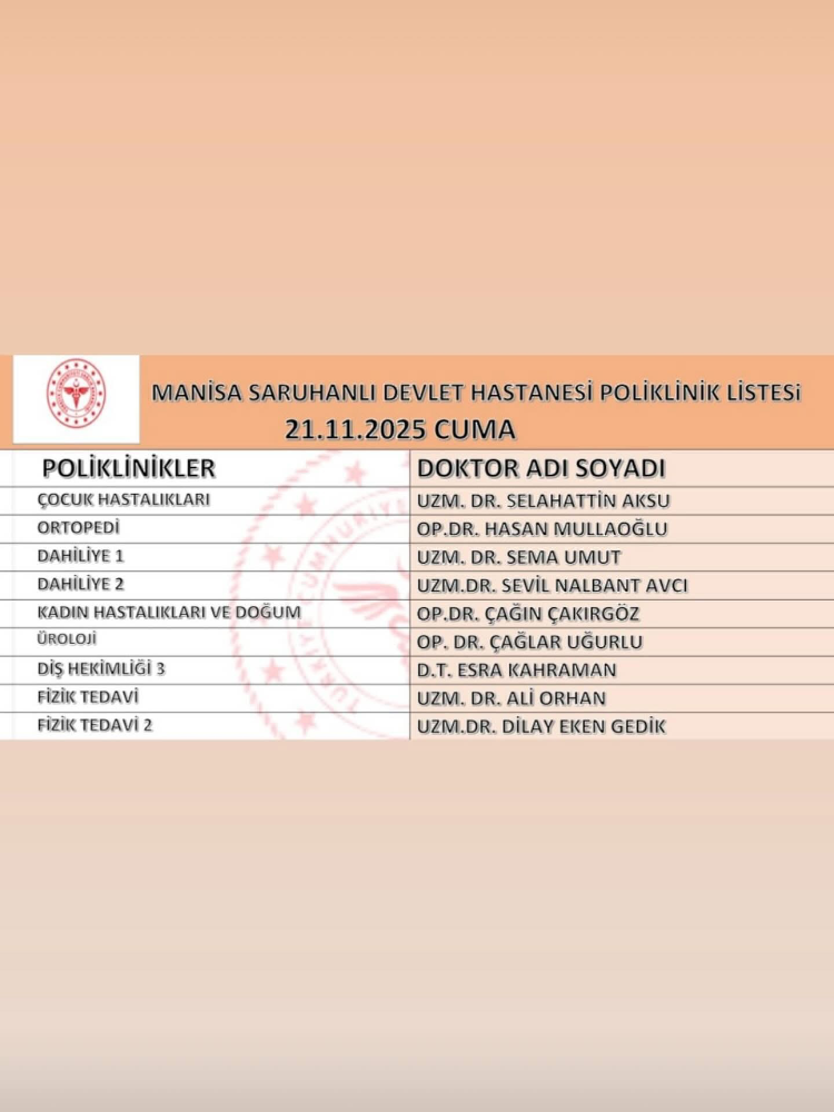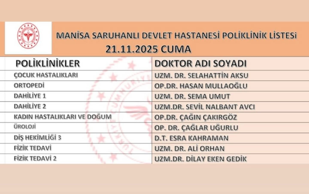 Saruhanlı Devlet Hastanesinde 21 Kasım 2025 Cuma günü çalışacak Doktorların listesi aşağıda verilmiştir.