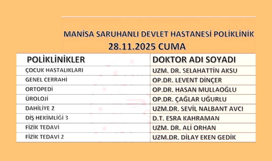 Saruhanlı Devlet Hastanesinde 28 Kasım 2025Cuma günü çalışacak Doktorların listesi aşağıda verilmiştir.