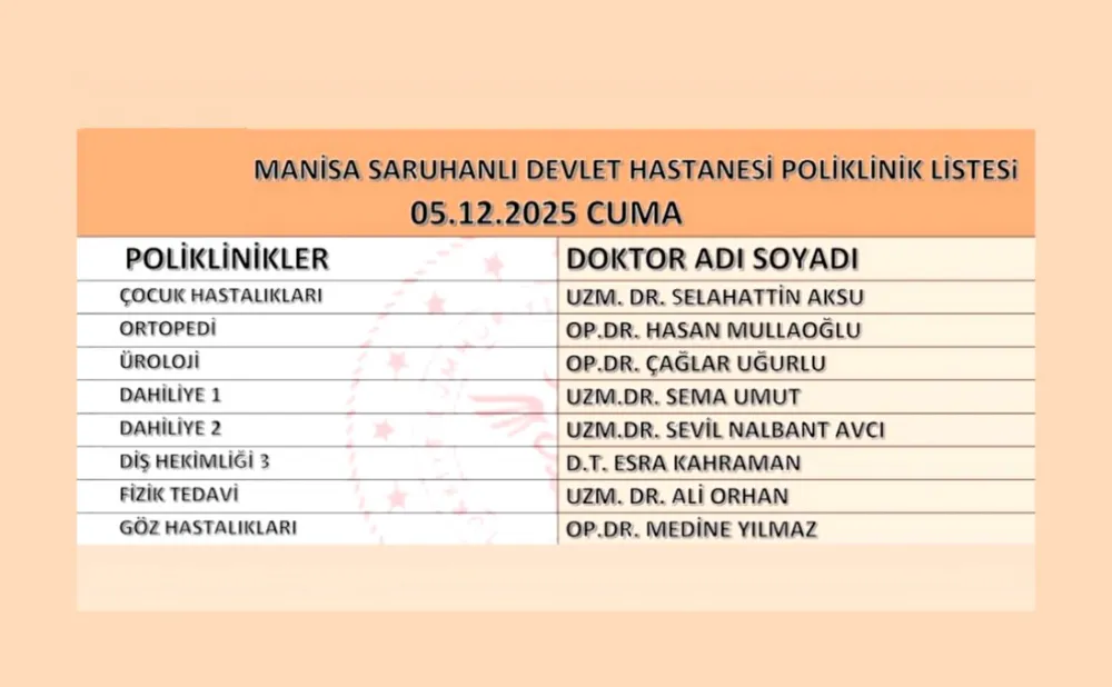 Saruhanlı Devlet Hastanesinde 5 Aralık 2025 Cuma günü çalışacak Doktorların listesi aşağıda verilmiştir.
