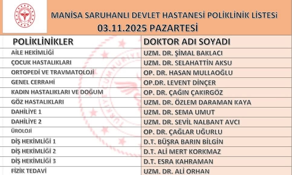 Saruhanlı Devlet Hastanesinde 3 Kasım 2025 Pazartesi günü çalışacak Doktorların listesi aşağıda verilmiştir.
