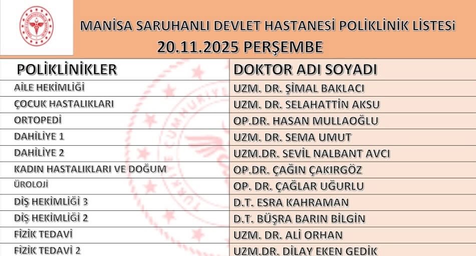 Saruhanlı Devlet Hastanesinde 20 Kasım 2025 Perşembe günü çalışacak Doktorların listesi aşağıda verilmiştir.