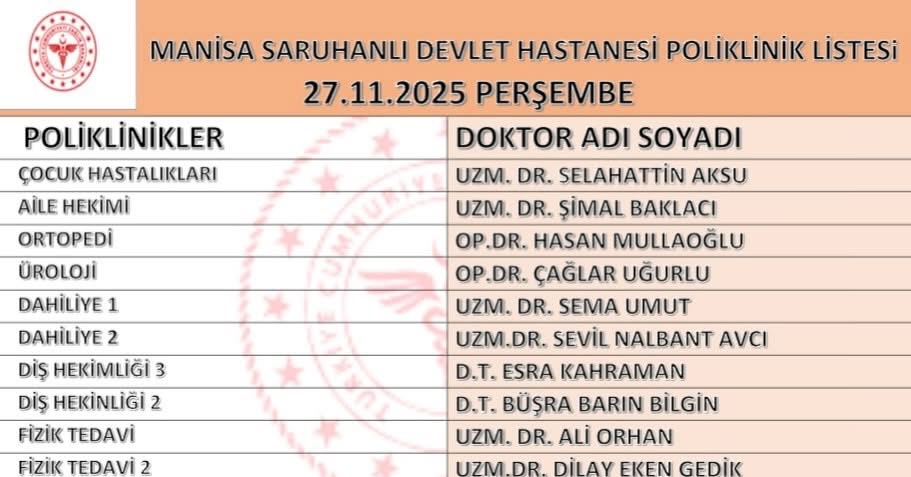 Saruhanlı Devlet Hastanesinde 27 Kasım 2025 Perşembe günü çalışacak Doktorların listesi aşağıda verilmiştir.