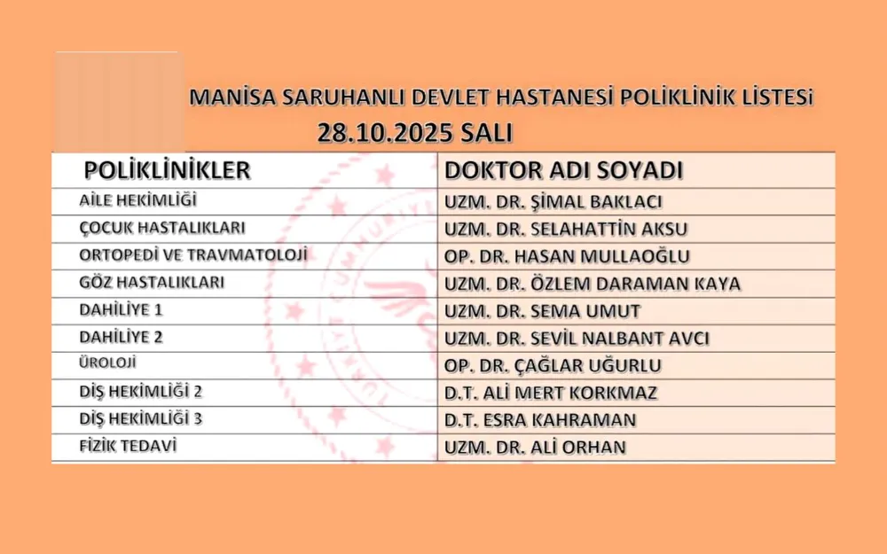 Saruhanlı Devlet Hastanesinde 28 Ekim 2025 Salı günü çalışacak Doktorların listesi aşağıda verilmiştir.