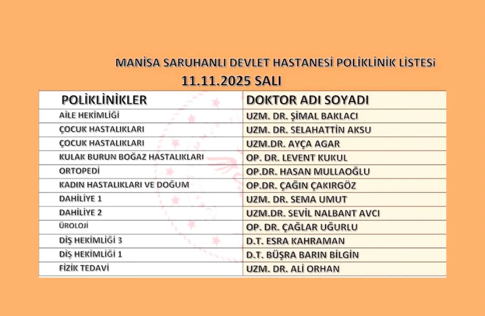 Saruhanlı Devlet Hastanesinde 11 Kasım 2025 Salı günü çalışacak Doktorların listesi aşağıda verilmiştir.