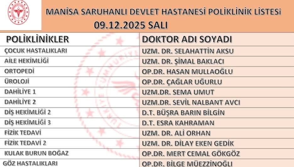 Saruhanlı Devlet Hastanesinde 9 Aralık 2025 Salı günü çalışacak Doktorların listesi aşağıda verilmiştir.