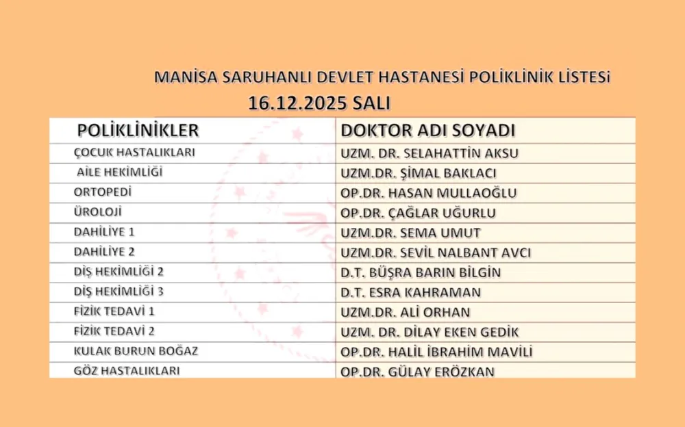 Saruhanlı Devlet Hastanesinde 16 Aralık 2025 Salı günü çalışacak Doktorların listesi aşağıda verilmiştir.
