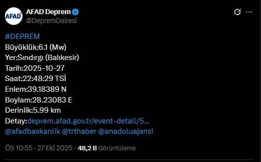 AFAD verilerine göre deprem, 27 Ekim 2025 Pazartesi günü saat 22.48’te (TSİ) kaydedildi. Depremin merkez üssü Sındırgı (Balıkesir) olarak açıklanırken, yerin 5,99 kilometre derinliğinde gerçekleştiği bildirildi.