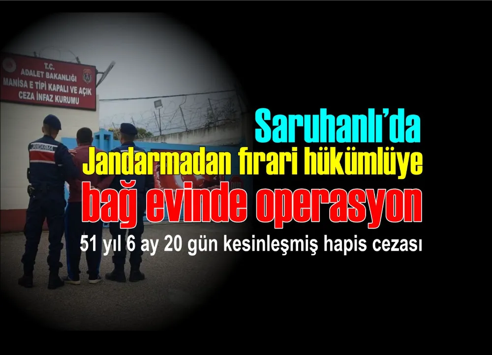 Saruhanlı İlçe Jandarma Komutanlığı ve Manisa İl Jandarma Komutanlığı JASAT ekipleri tarafından aranan şahısların yakalanmasına yönelik yürütülen çalışmalar kapsamında, 51 yıl 6 ay 20 gün kesinleşmiş hapis cezası bulunan Y.A. (48) saklandığı bağ evinde yakalandı.