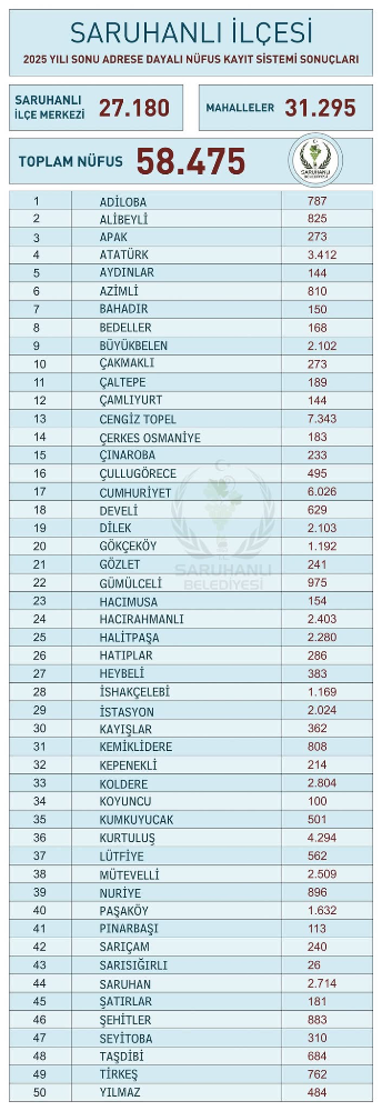 Saruhanlı ilçesinin nüfusu, bir önceki yıla göre 540 kişi artarak 58 bin 475’e yükseldi. İlçe merkezinde nüfus artışı yaşanırken, kırsal mahallelerde düşüş kaydedildi.