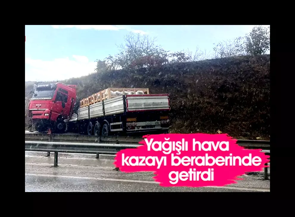 Manisa’nın Kula ilçesinde etkili olan yağışlı hava, trafik kazasını da beraberinde getirdi. Sürücüsünün kontrolünden çıkan tır makaslayarak yolu kapattı. Kaza nedeniyle İzmir-Ankara D300 karayolunun Uşak istikametine trafik bir süre sağlanamadı.