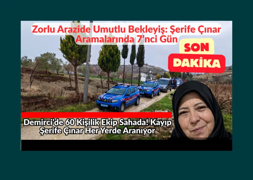 Demirci ilçesine bağlı Çamlıca Mahallesi’nde yaşayan ve kendisinden haber alınamayan Şerife Çınar için 2 Ocak’ta başlatılan arama çalışmaları genişletilerek sürdürülüyor. Kayıp ihbarının ardından bölgeye sevk edilen Demirci İlçe Emniyet Müdürlüğü, İlçe Jandarma Komutanlığı, AFAD, Jandarma Arama Kurtarma (JAK), AKUT ve Demirci Belediyesi Arama Kurtarma ekiplerinden oluşan yaklaşık 60 kişilik ekip, kaplıca mevkii ile Yortan mevkii arasındaki yaklaşık 5 kilometrelik alanda yoğun arama yaptı.