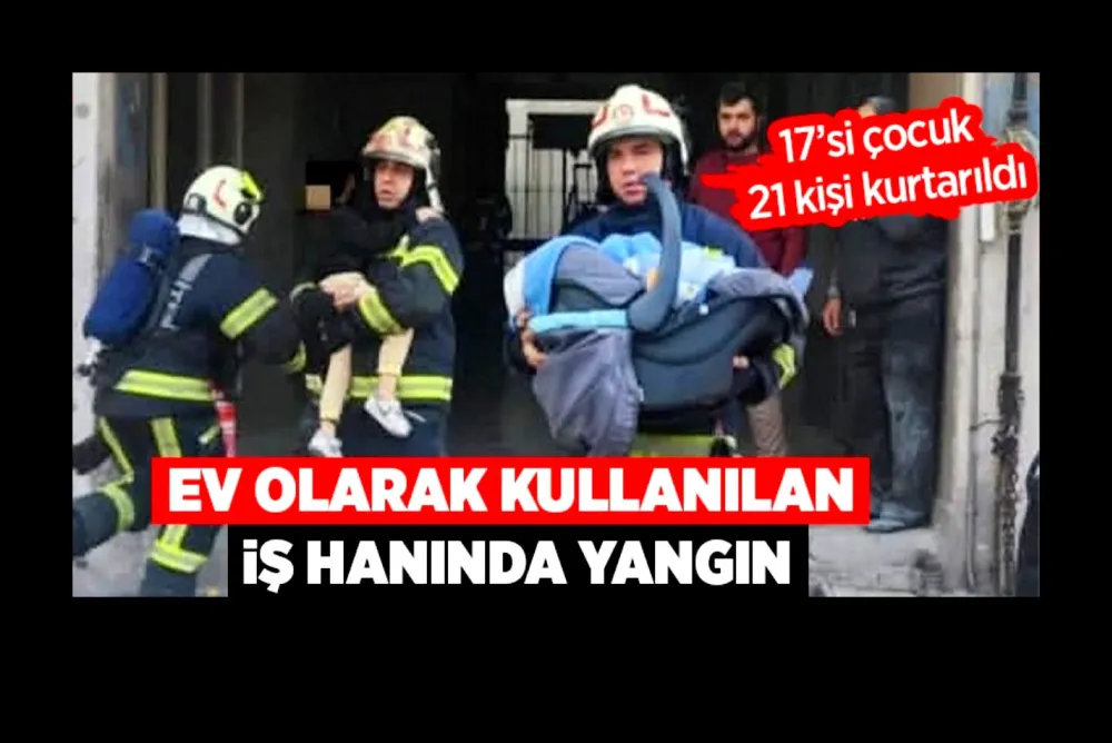 Ev olarak kullanılan iş hanında çıkan yangında 17’si çocuk 21 kişi kurtarıldı