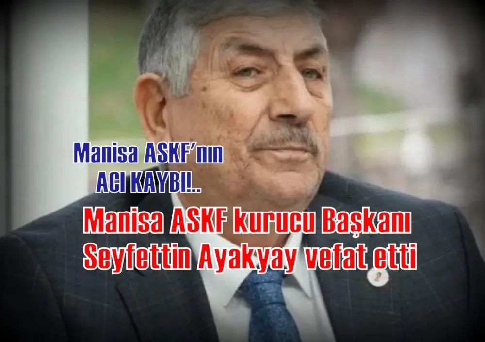 Manisa ASKF kurucu Başkanı Seyfettin Ayakyay vefat etti.Merhuma Allah’tan rahmet, ailesine ve sevenlerine başsağlığı dileriz.Cenazesi (Bugün) 25 Ekim Cumartesi Günü İkindi namazına müteakip Manisa Ayyıldız Ehlibeyt Camii'nden kaldırılacaktır.