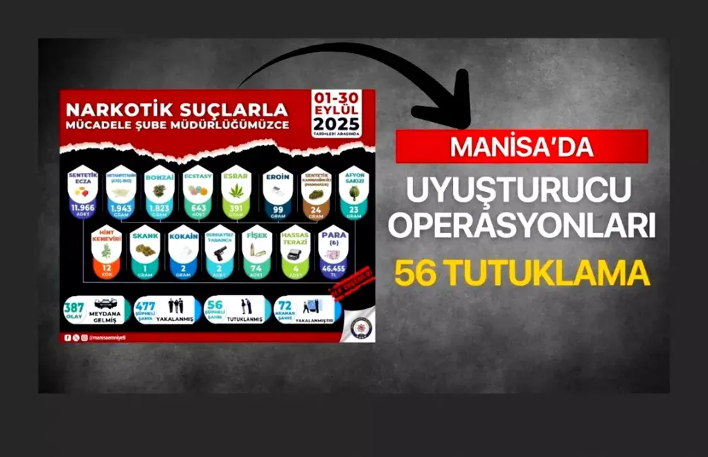 Manisa İl Emniyet Müdürlüğü Narkotik Suçlarla Mücadele Şube Müdürlüğü koordinesinde, Akhisar, Alaşehir, Salihli, Soma ve Turgutlu NSM Büro Amirliklerinin desteğiyle 1-30 Eylül 2025 tarihleri arasında yürütülen çalışmalar sonucunda 387 olay meydana gelirken, 477 şüpheli yakalandı. Şüphelilerden 56'sı tutuklanırken, 72 aranan şahıs da yakalandı. Yapılan operasyonlarda; 11 bin 966 sentetik ecza (hap), bin 943 gram metamfetamin, bin 823 gram sentetik kannabinoid (bonzai), 643 ecstasy hap, 391 gram esrar, 99 gram eroin, 24 gram sentetik kannabinoid hammaddesi, 23 gram afyon sakızı, 12 kök hint keneviri, 1 gram skank, 2 gram kokain, 2 ruhsatsız tabanca, 74 fişek, 4 hassas terazi ve uyuşturucu madde ticaretinden elde edildiği değerlendirilen 46 bin 455 TL para ele geçirildi.