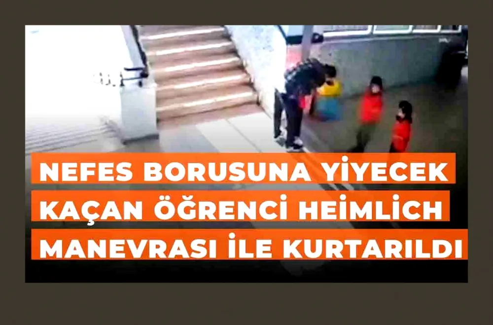 Sivas'ta teneffüs sırasında nefes borusuna mandalina parçası kaçan 11 yaşındaki ortaokul öğrencisi, nöbetçi öğretmen tarafından başarılı bir şekilde kurtarıldı. Öğretmen, ilkyardım eğitimi ile öğrendiği Heimlich manevrasını uygulayarak durumu kontrol altına aldı.