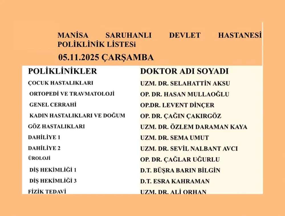 Saruhanlı Devlet Hastanesinde 5 Kasım 2025 Çarşamba günü çalışacak Doktorların listesi aşağıda verilmiştir.