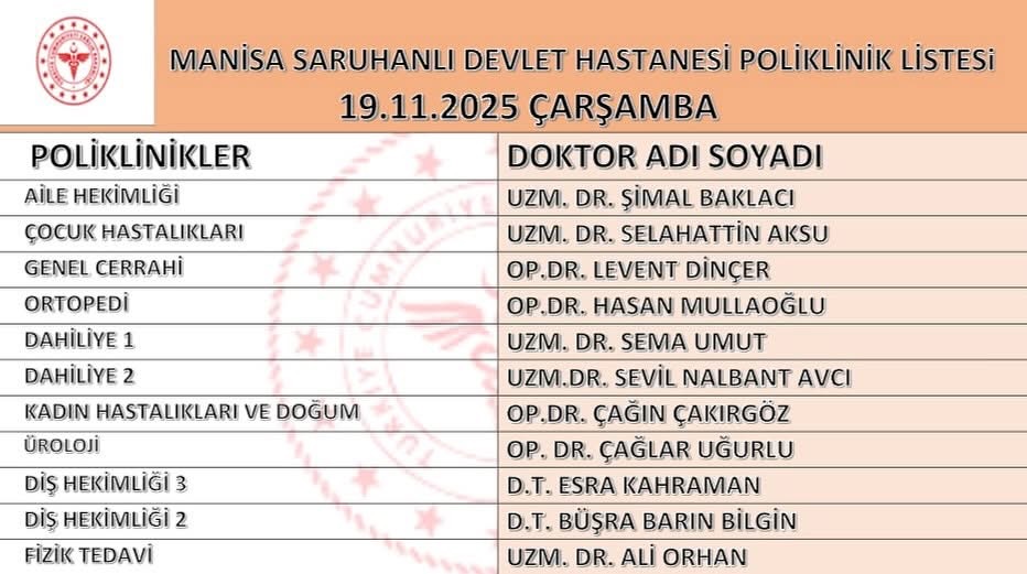 Saruhanlı Devlet Hastanesinde 19 Kasım 2025 Perşembe günü çalışacak Doktorların listesi aşağıda verilmiştir.