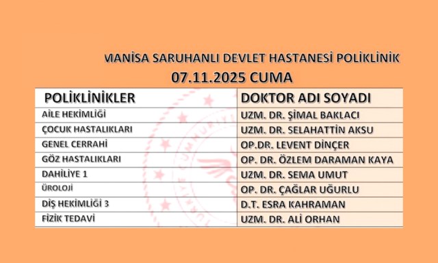 Saruhanlı Devlet Hastanesinde Cuma günü görev yapacak doktorlarSaruhanlı Devlet Hastanesinde 7 Kasım 2025 Cuma günü çalışacak Doktorların listesi aşağıda verilmiştir.Saruhanlı Kardelen Gazetesi ailesi olarak tüm hastalarımıza acil şifalar dileriz…