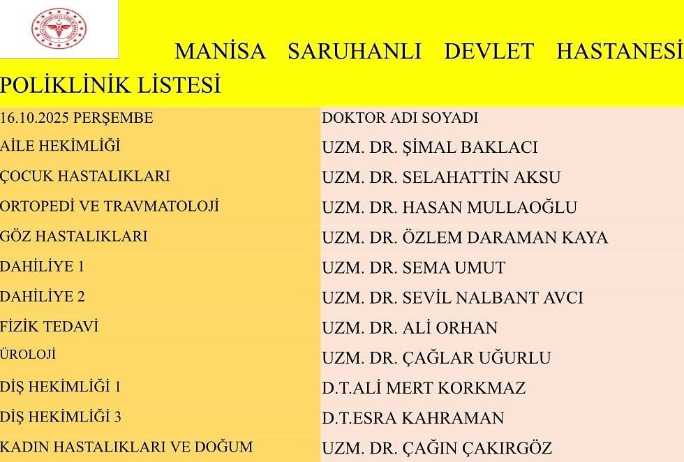 Saruhanlı Devlet Hastanesinde 16 Ekim 2025 Perşembe günü çalışacak Doktorların listesi aşağıda verilmiştir.