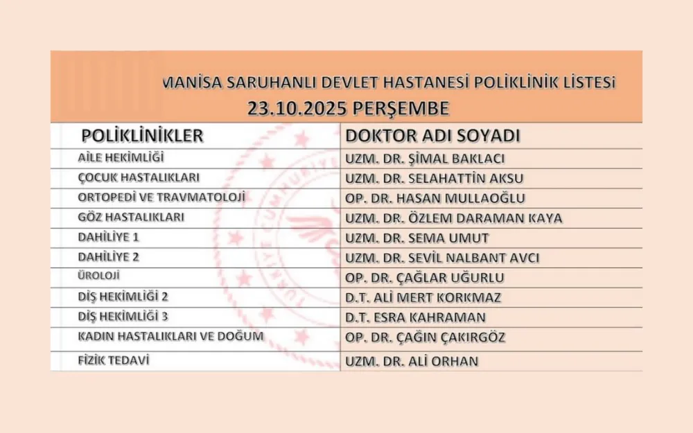 Saruhanlı Devlet Hastanesinde 23 Ekim 2025 Perşembe günü çalışacak Doktorların listesi aşağıda verilmiştir.