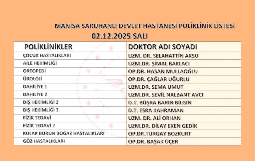 Saruhanlı Devlet Hastanesinde 2 Aralık 2025 Salı günü çalışacak Doktorların listesi aşağıda verilmiştir.