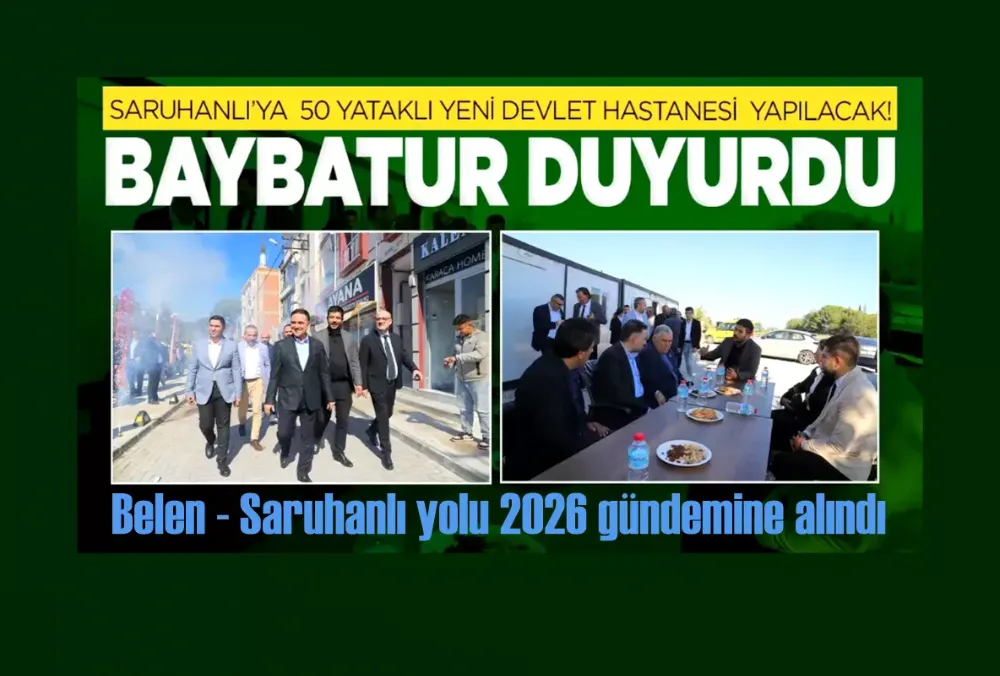 Saruhanlı’ya 900 milyonluk 50 yataklı devlet hastanesinin kısa sürede yapılarak hizmete açılacağını belirten Baybatur, şöyle konuştu:"Saruhanlı ziyaretimizde çok güzel bir tabloya şahit olduk. Hem belediyemizin yürüttüğü hizmetleri yerinde inceledik hem de vatandaşlarımızın taleplerini dinledik. Ulaştırma ve Altyapı Bakanımız Abdulkadir Uraloğlu ile yaptığımız görüşmede, Saruhanlı–Belen yolunun ihalesinin kısa süre içinde gerçekleştirileceği müjdesini vatandaşlarımızla paylaştık. Bunun yanı sıra ilçemize kazandırılacak 50 yataklı yeni devlet hastanemiz 900 milyon liralık önemli bir yatırımla hayata geçirilecek. Saruhanlı Belediyemiz ilçemizde güzel ve örnek çalışmalara imza atıyor. AK Parti olarak biz, Cumhurbaşkanımız Recep Tayyip Erdoğan’ın liderliğinde, hizmet siyaseti anlayışıyla milletimizin refahı ve huzuru için gece gündüz çalışmaya devam ediyoruz"